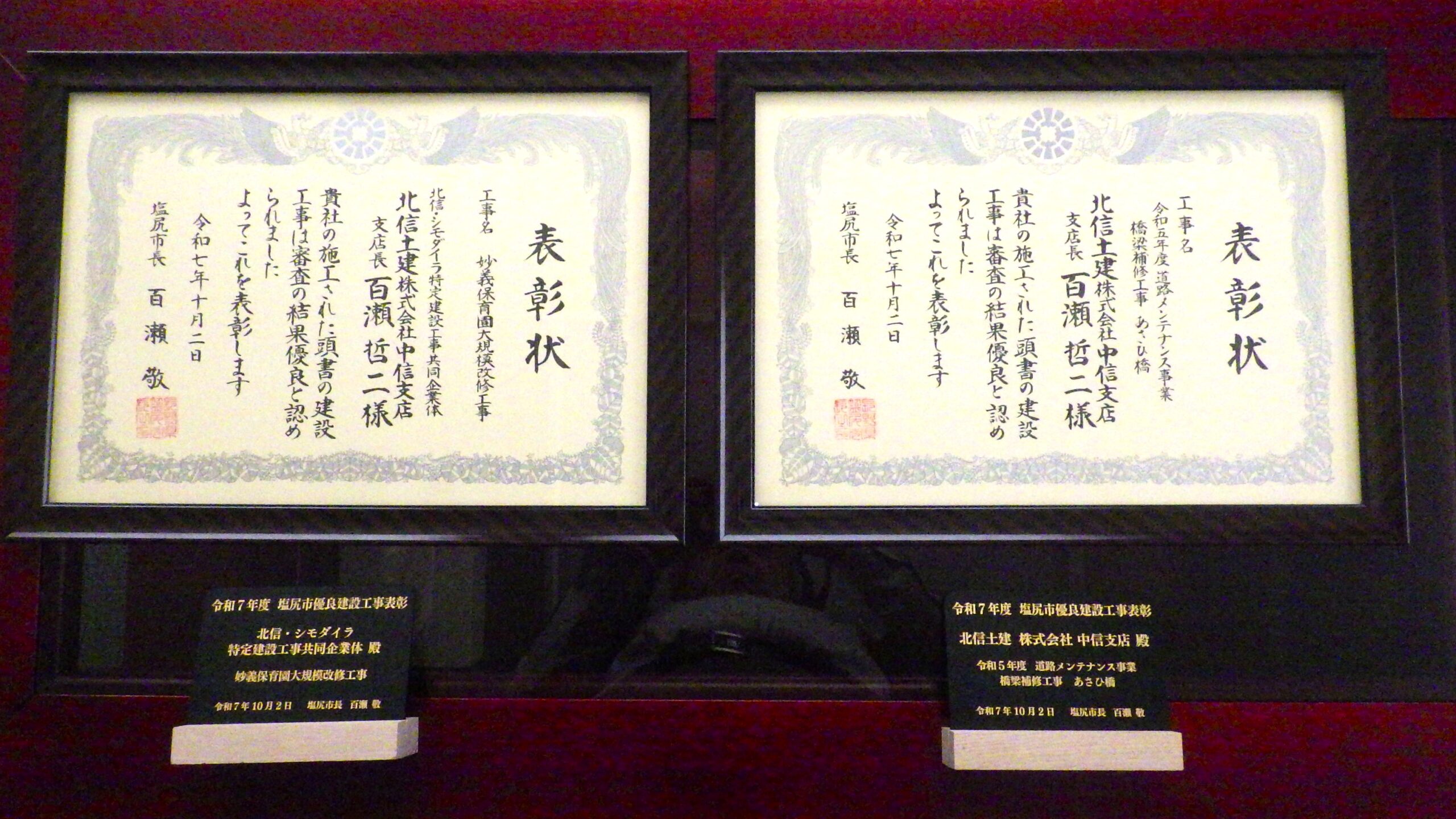 2025年10月2日(木) 塩尻市保健福祉センターにて、「令和7年度塩尻市優良建設工事表彰式」が開催され、中信支店が施工した2件が受賞しました。