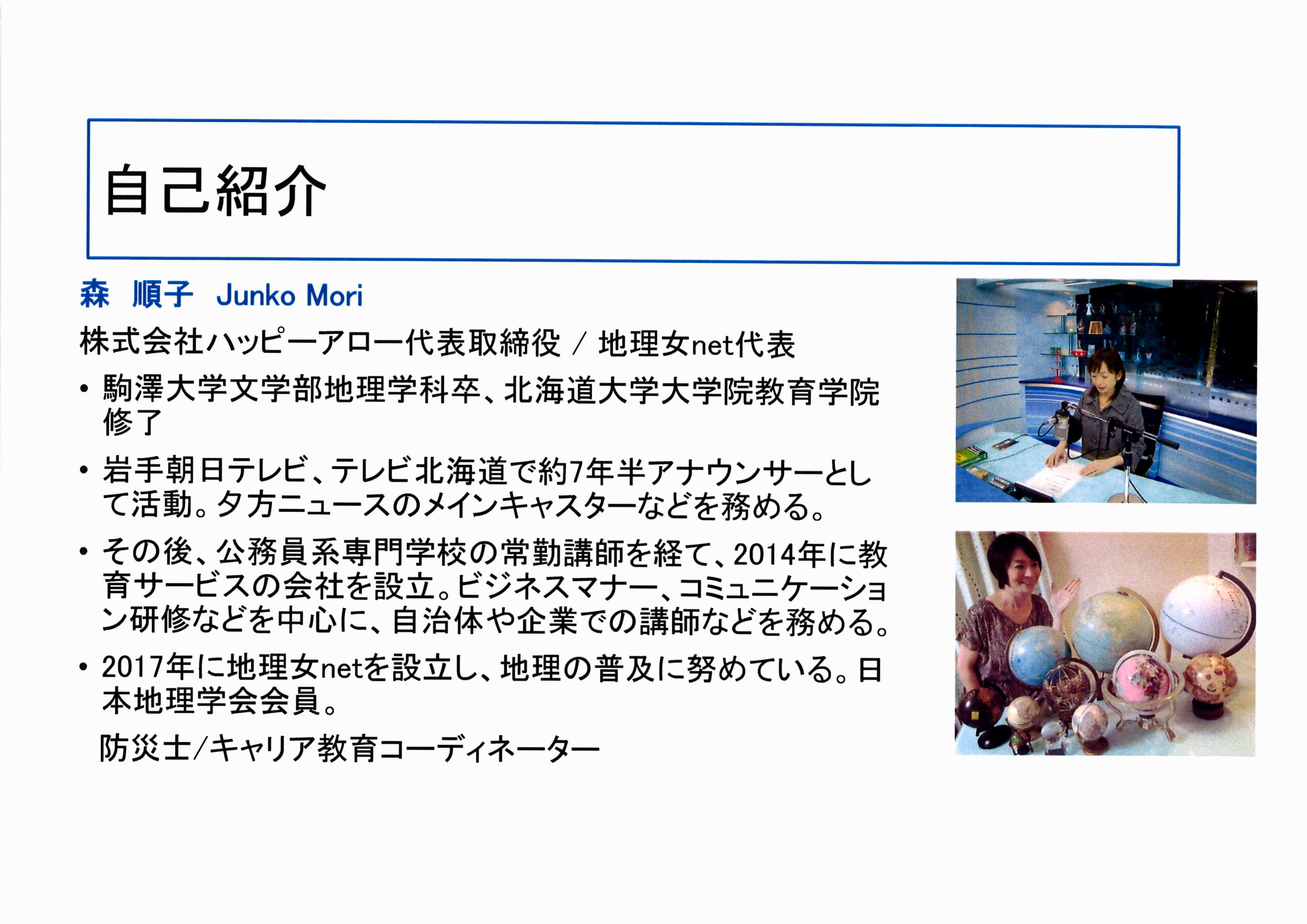 株式会社ハッピーアロー代表取締役及び「地理女net」代表でいらっしゃいます森 順子様より「地理女が伝える 地図と地名が語る安全」と題し、ご講演いただきました。